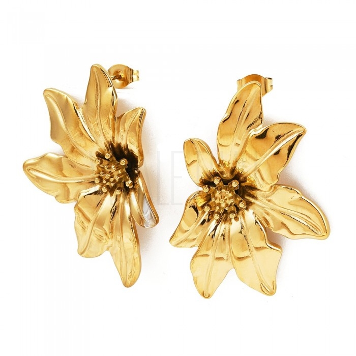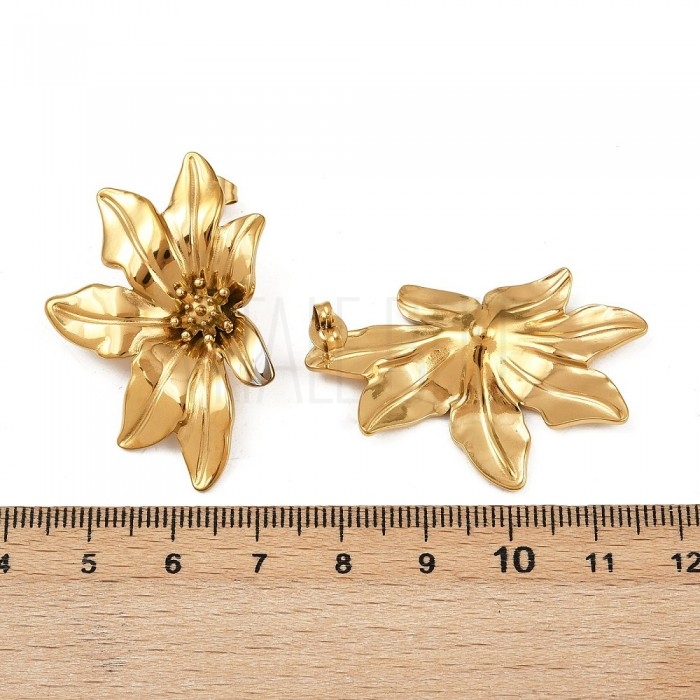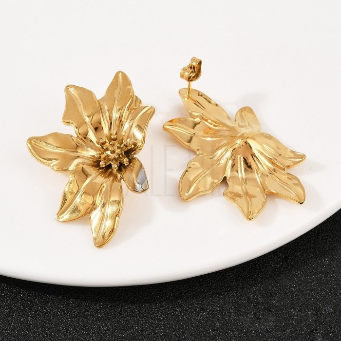 Brinco Flor Texturizada 41x27mm em Aço Inoxidável Dourado
