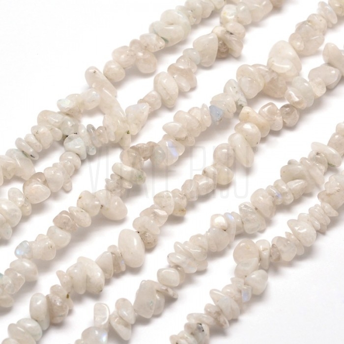 Fio de contas em pedra da lua natural com formato irregular tipo chip, ideal para criação de peças de bijuteria com um estilo orgânico e sofisticado. As tonalidades suaves e os reflexos característicos desta pedra conferem um toque delicado e elegante a qualquer criação.
