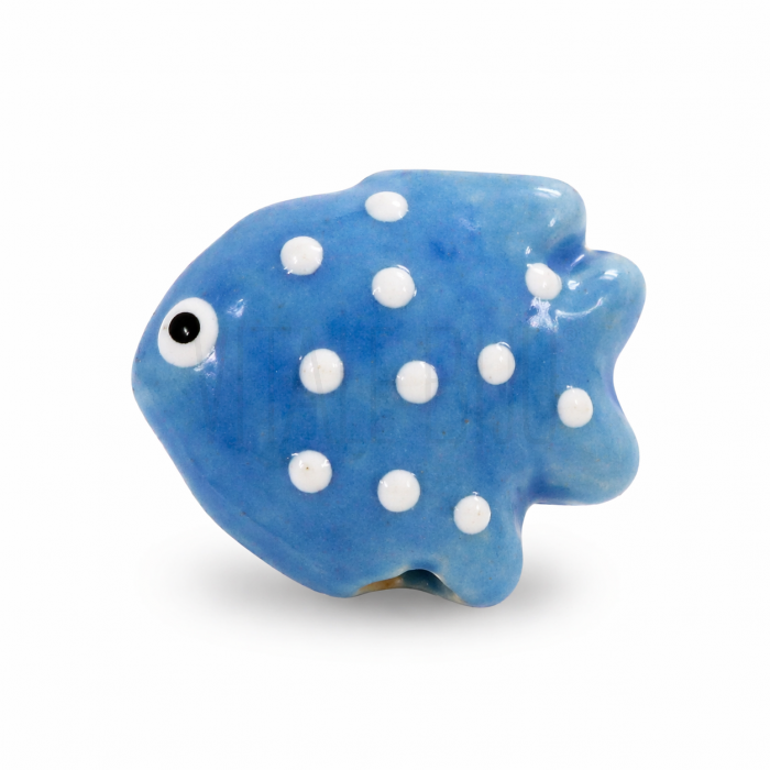 A peça apresenta acabamento em cerâmica azul com pintas brancas em relevo que destacam o formato do peixe. O esmalte vidrado proporciona brilho e proteção à peça, garantindo um acabamento durável e um aspeto elegante.