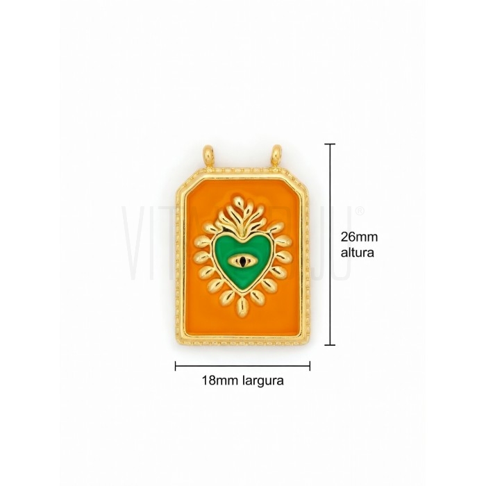 Pendente/Escapulário super tendência com acabamento esmaltado , detalhe de coração com olho central e moldura dourada elegante. Uma peça cheia de personalidade, perfeita para criar colares exclusivos e modernos.